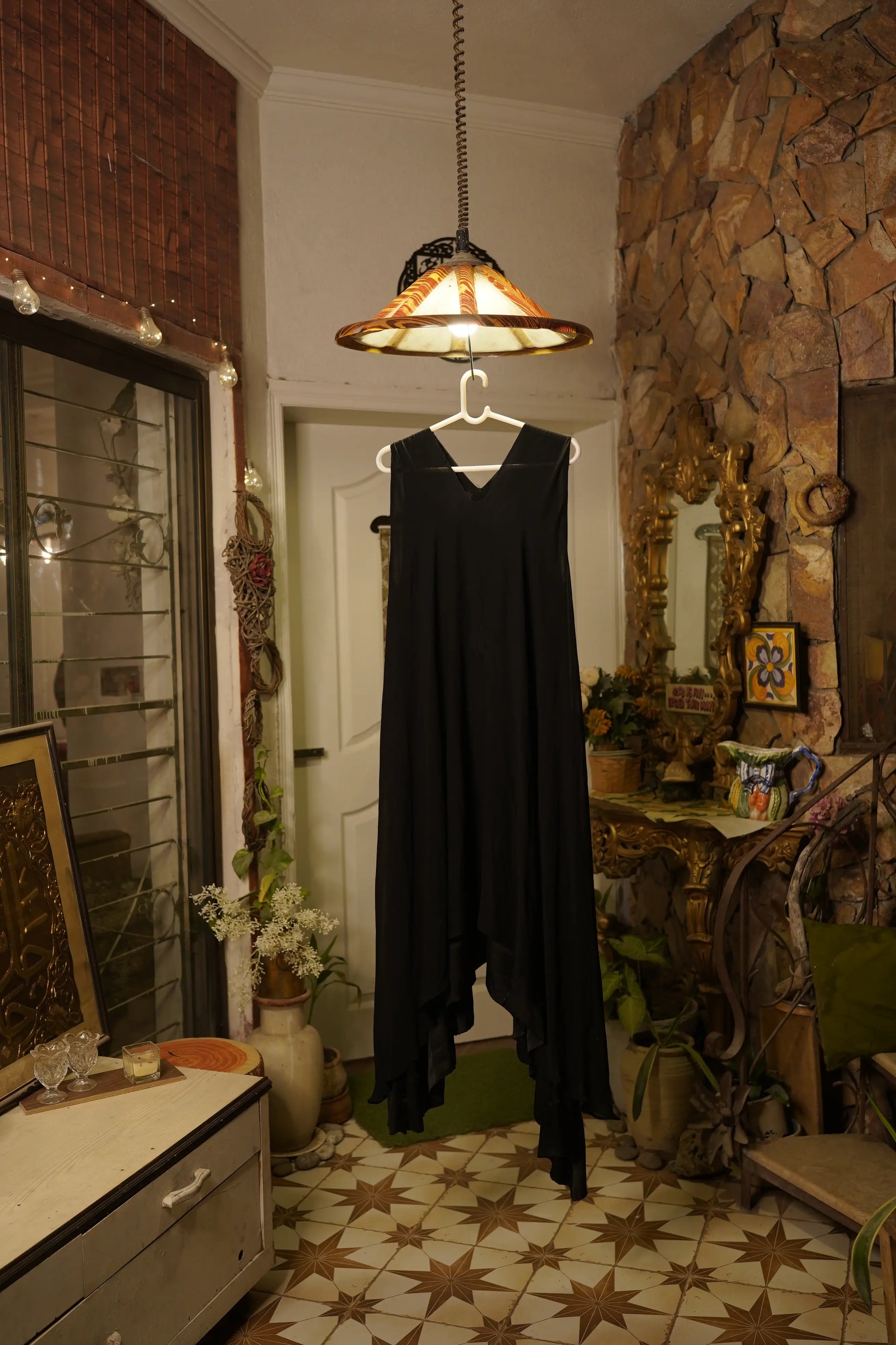 A sleek black dress with a fluid asymmetrical hemline, perfect for making a subtle yet striking statement. Its V-neck silhouette effortlessly blends modern edge with graceful movement.